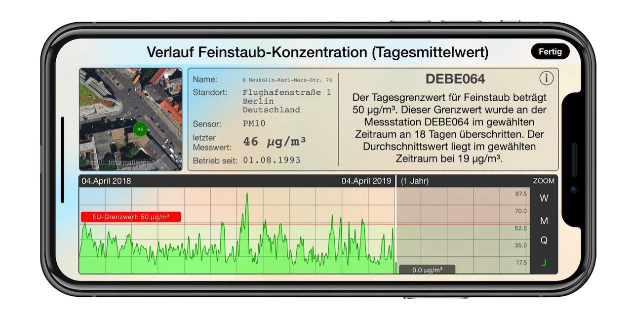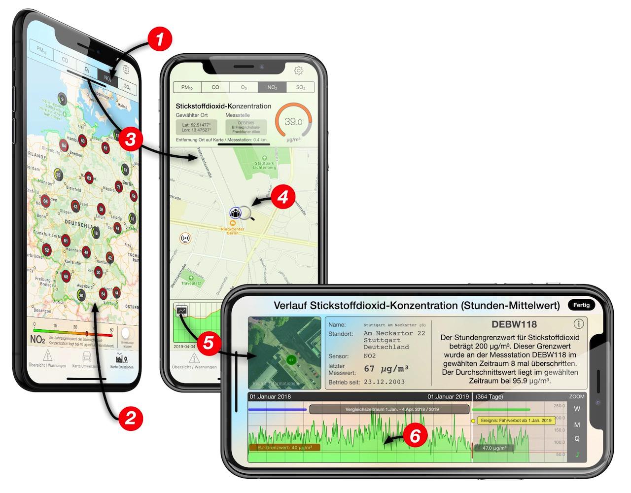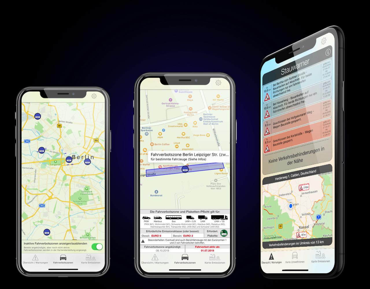 Die App kennt alle Umwelt- und Fahrverbotszonen innerhalb Deutschlands. Aus den unter "Einstellungen" eingegebenen Daten deines Fahrzeuges wird die Emissionsklasse bestimmt und mit den Zonendaten verglichen.