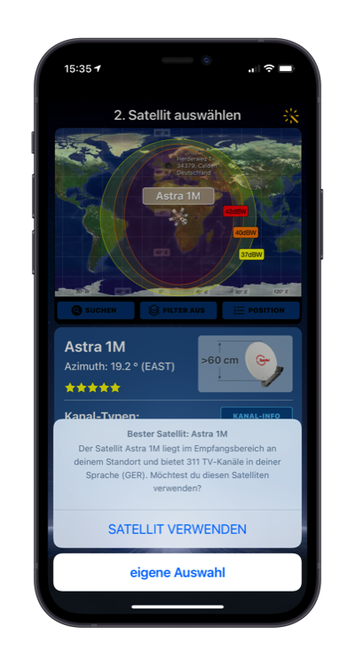 Du kannst aber auch den Assistenten verwenden um einen geeigneten Satelliten für deinen Standort zu finden. Der Assisten überprüft an Hand deiner Geoposition, deiner Antennengröße und der im iPhone eingestellten Sprache den Satelliten mit den besten Empfangsaussichten und den meisten Kanälen in deiner Sprache.