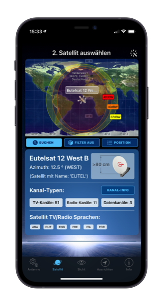 Du kannst aber auch den Assistenten verwenden um einen geeigneten Satelliten für deinen Standort zu finden. Der Assisten überprüft an Hand deiner Geoposition, deiner Antennengröße und der im iPhone eingestellten Sprache den Satelliten mit den besten Empfangsaussichten und den meisten Kanälen in deiner Sprache.