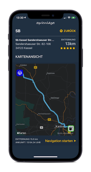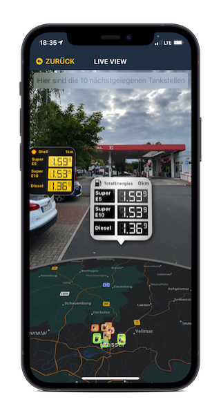 Mit der AR-Ansicht projizierst du die aktuellen Kraftstoffpreise der Tankstellen in deiner Umgebung in die Live-Ansicht deines iPhones.