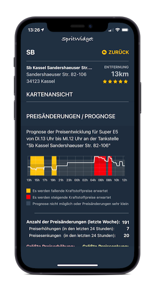 Sprit Widget ermittelt aus historischen Daten des Preisverlaufs mit einem KI-basierten Algorithmus die nächste Preiserhöhung oder Preissenkung.
